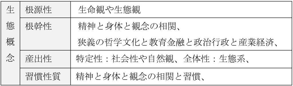「あらゆる現象に生命が宿る」など言った根源的な感性を反映し生態概念をベースにして法規の体系に連ね良好な概念と稼働に回る内外性に及び健全な表現者や創造者が形成される。生命観や生態観が土台性を生み、教育金融と政治行政と産業経済、社会性や自然観、生態系に現れる。